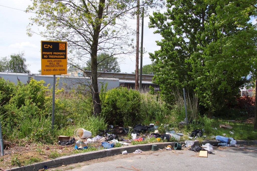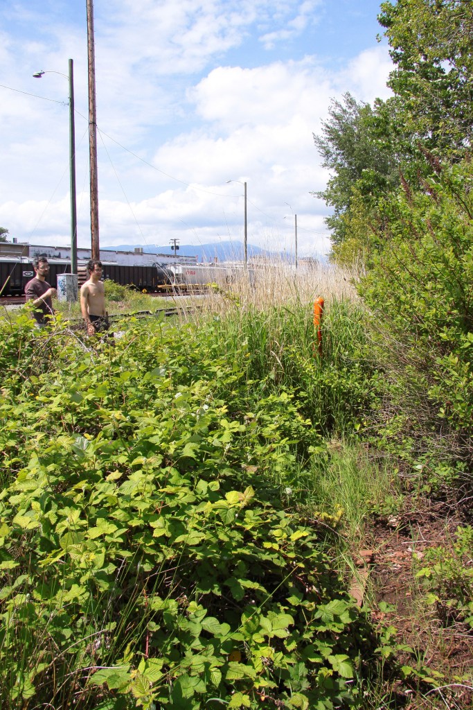 This question has been answered in an example we’ve been presented with by members of The Purple Thistle (a youth-run arts and activism centre). A registered participant of this year’s BCWF Wetland Institute Workshop has recently become engaged in the troubled life of an ephemeral wetland that sits on the fringe of a Purple Thistle urban garden in the Strathcona neighbourhood off of Clark Drive, in Vancouver. They invited Neil Fletcher (BCWF’s Wetlands Education Program Coordinator) to come out and visit the wetland in question and I, as usual, came along for the site visit. We found a team of young people in sun hats working hard in the midst of grounds mulched with straw. The weather has been warm recently and water is hard to come by in this area as the city and adjacent buildings have not supplied a tap. While this “Food Forest” they have created looks clean, well-maintained and productive, the grounds just to the left were covered in trash (which these volunteers have attempted to remove). This is where we found the ephemeral wetland: hemmed in by industrial development on one side, and CN Rail on the opposite.