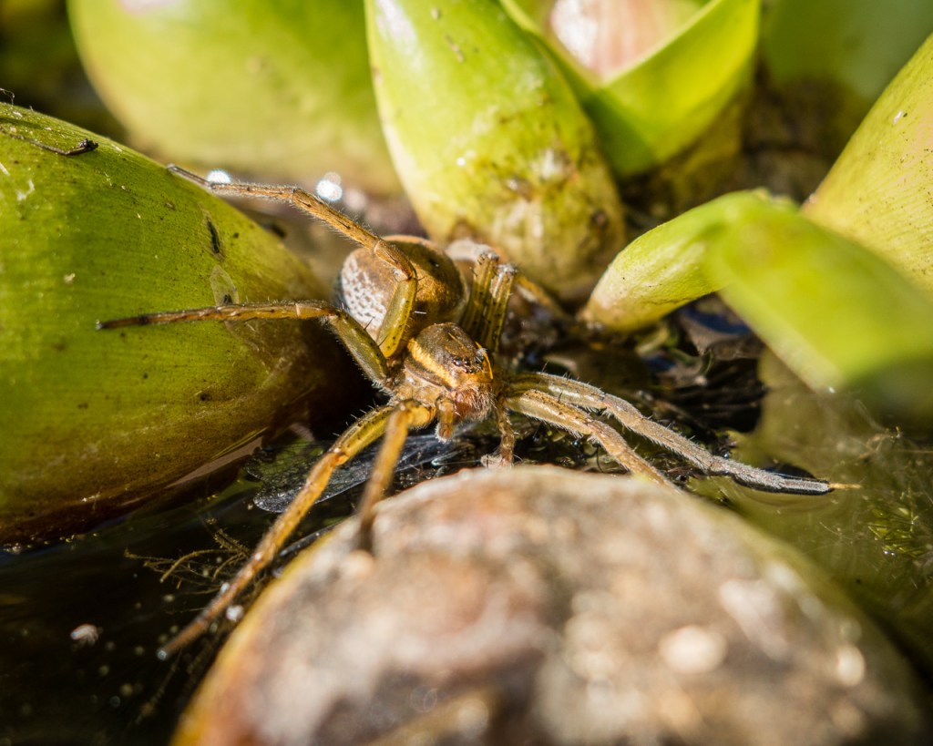 Dolomedes triton is also known as the six-spotted fishing spider, so named for the spots on the underside of it’s body. It is also identified by a pale stripe running along each side of the grey or brown coloured body. As with many spiders species, the females are much larger than the males, up to 6 cm in length.