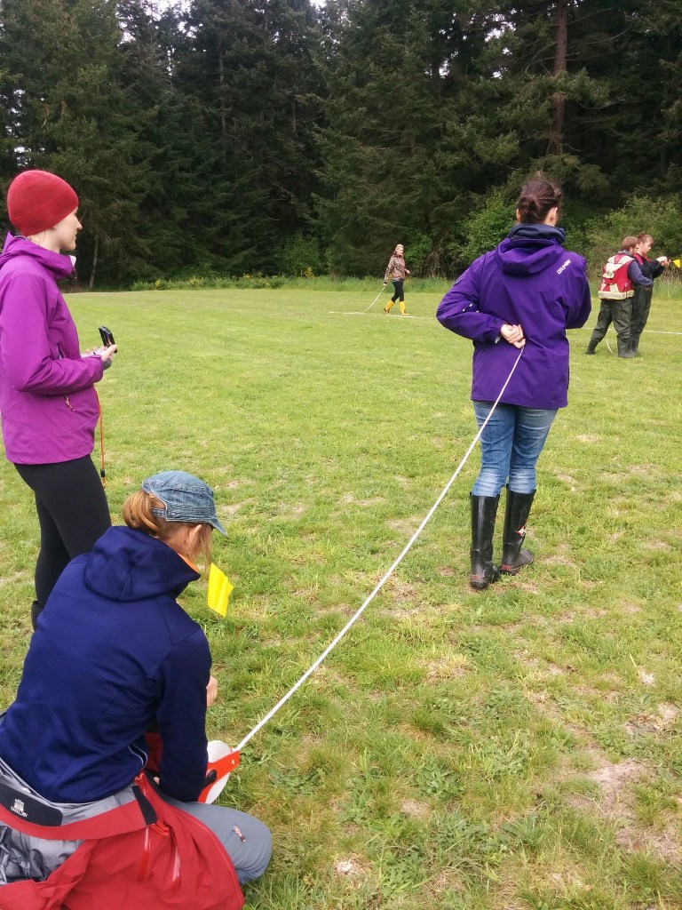 We then headed into the field to zone the large wetland at Rathtrevor Beach Provincial Park. Michele taught the group how to use a compass, and participants split into six groups to complete a compass navigation exercise. Each group selected a location in the field to place an animal marker and was given three different compass headings with specific distances. After completing all three legs, the goal was to end up back at their original marker—and all six groups succeeded!