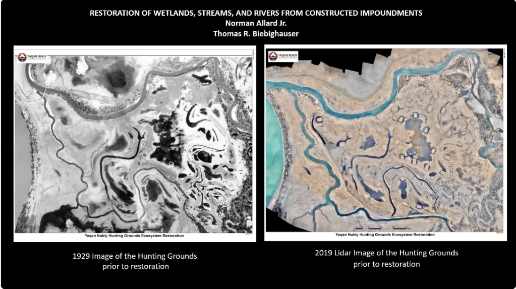 - Floodplain Restoration: A Case Study. Norm Allard Jr., Community Planner with the Lower Kootenay Band, and Tom Biebighauser, Wetland Restoration Expert, discussed the techniques used to restore floodplains and decommission impoundment dikes at the Hunting Grounds Ecosystem Restoration project on Yaqan Nukiy territory in Creston, BC. This multi-phase, landscape-level project is a first of its kind in British Columbia and involved the restoration of floodplains, wetlands, streams, and rivers damaged by the construction of impoundments, dams, ditches, and the installation of pipes and pumps. To date, 40 ha (98.8 acres) of wetlands have been restored at this site and over 90 ha (222 acres) of floodplain have been reconnected to the Goat River.
