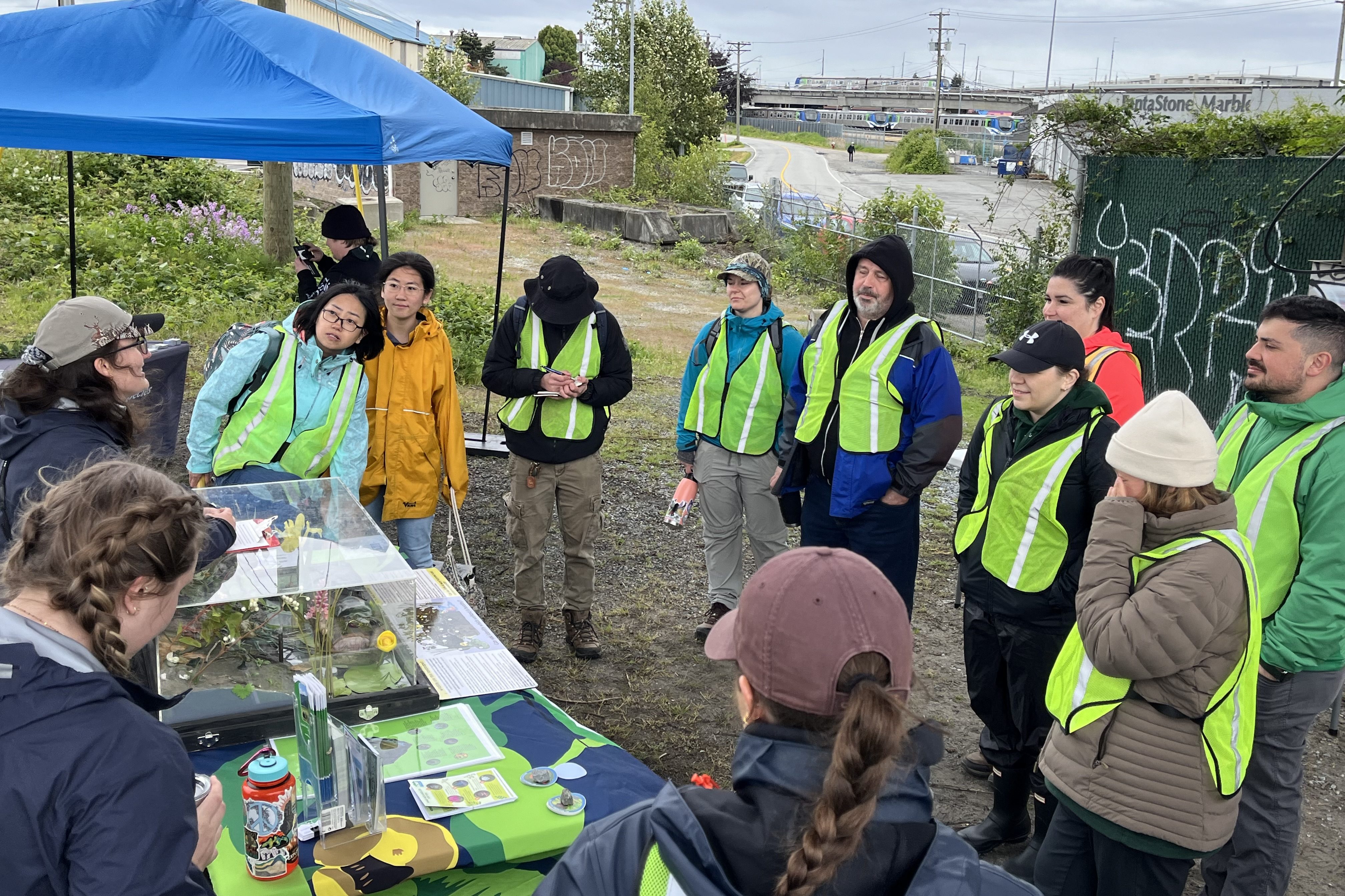 During their tenure, the Spring/Summer Fraser River Field Crew hosted two community events with various partners, including the Invasive Species Council of BC and the Tsawwassen First Nation. At the first clean-up event under the Oak St. Bridge, the Invasive Species Council of BC provided public education about local invasives such as blackberry and black locust, both of which establish well in disturbed habitats. One of the Field Technicians, Josh, spent about an hour with participants removing invasives and making pencils from blackberry branches. Attendees practiced using their new pencils by drawing marsh species.