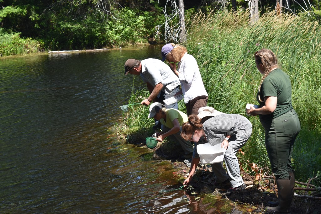 After looking at the soils and plants near Village Bay Lake, we travelled down a nearby forest service road to reach Nighthawk Lake – a wetland area brought to the attention of the Water Security Team by some of their volunteers. A marsh and shallow-open water wetland complex at the outlet of Nighthawk Lake, and home to an old beaver dam became our base for an investigation into benthic macroinvertebrates. Participants started by breaking down benthic macroinvertebrates into three parts: