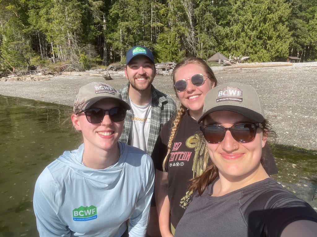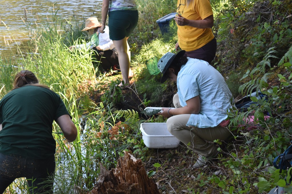 On our last day, we welcomed BCWF’s Engagement Coordinator Kendall McLaughlin, who shared their passion and immense knowledge on B.C.’s Coastal Amphibians. Kendall taught us how to identify different species of frogs and salamanders in both adult and tadpole stage, and took us to a potential future restoration site where participants collected amphibian traps which were set the night before, finding a northern red-legged frog and plenty of benthic macroinvertebrates – or as we affectionately call them, “bugs in the mud.”