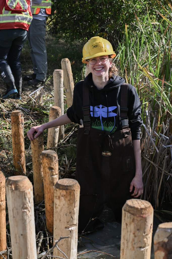 Jennifer Rogers atop one of the BCWF’s first BDAs, built for educational purposes in collaboration with the British Columbia Institute of Technology, Nooaitch Indian Band, and Lower Nicola Indian Band.