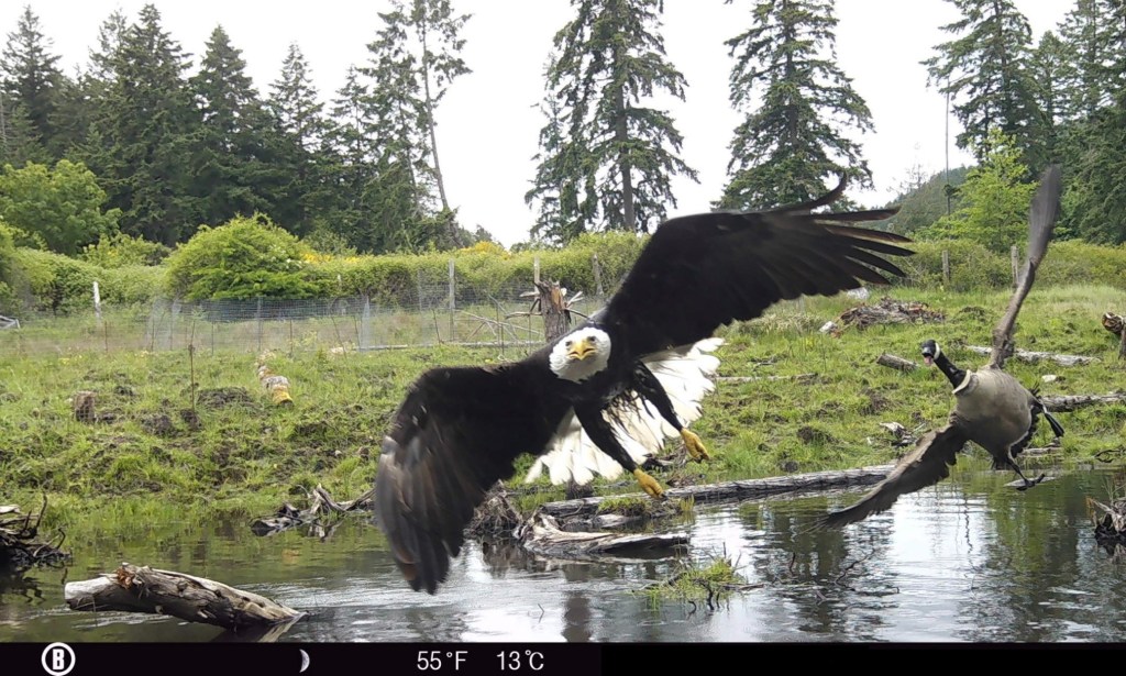 Canada goose chasing off a bald eagle on a wildlife cam set up at the Pender Island wetland restoration site.