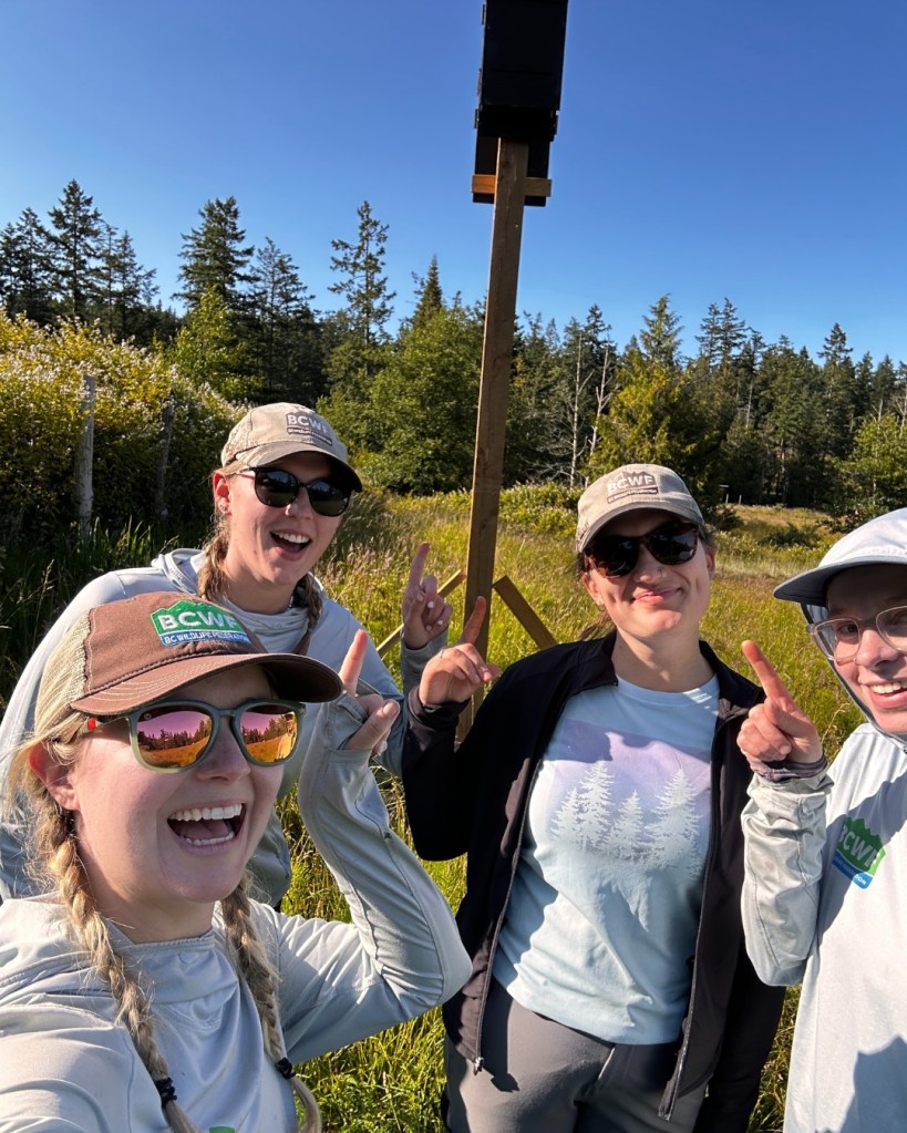 The team and one of the other bat boxes at the Pender Island wetland restoration site