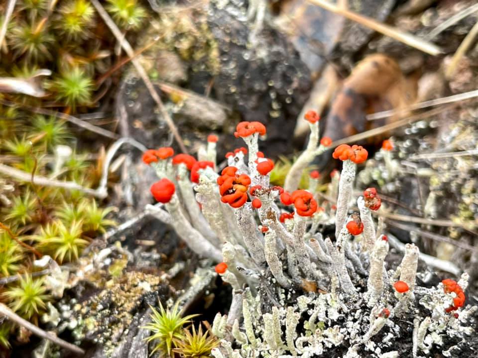 Lipstick Cup Lichen (Cladonia macilenta) can be found on dead wood, the base of trees, and on rocks.