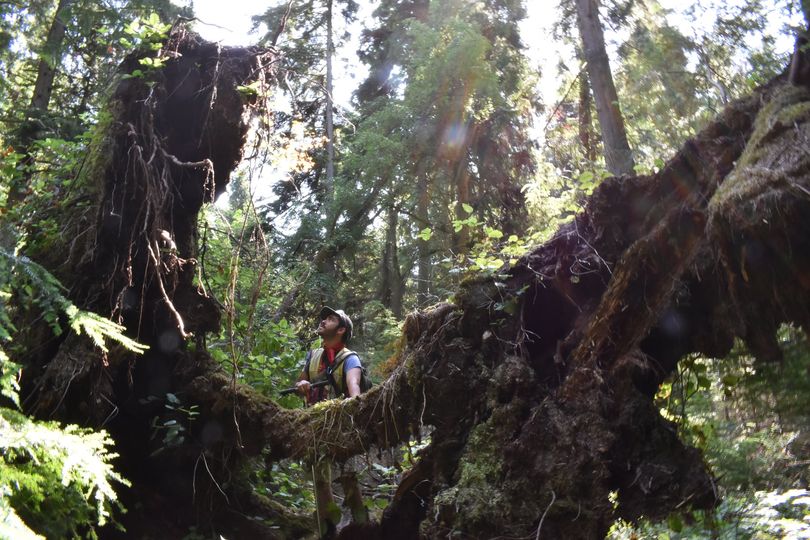 One of the Field Technicians with the Wildcoast Ecological Society work-pod stands on a magnificent fallen tree in a pocket of swamp skirting Camosun bog.