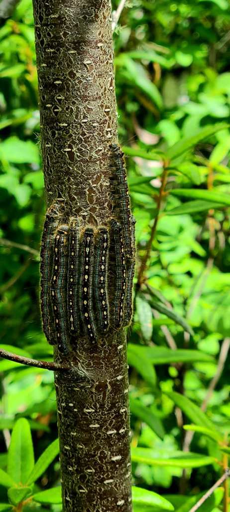 The Forest Tent Caterpillar (Malacosoma disstria) spins silken mats on tree trunks and large branches where they congregate to molt or rest from feeding.